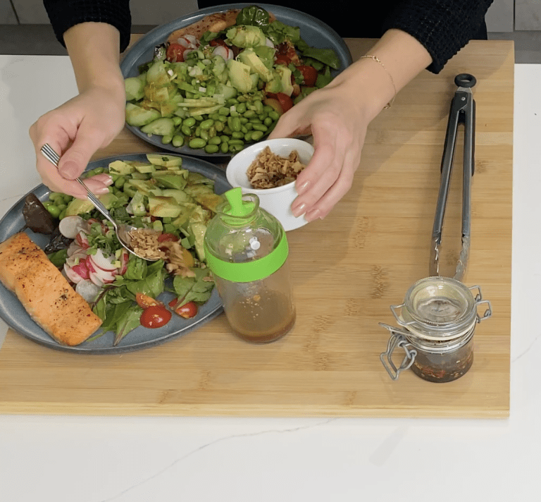 Tony wanted something light and healthy, so I decided to make Salmon salad with Asian ginger sesame dressing. The dressing is a star alongside salmon (or trout in this case). It has everything to tickle your taste buds and fill your tummy without many calories.